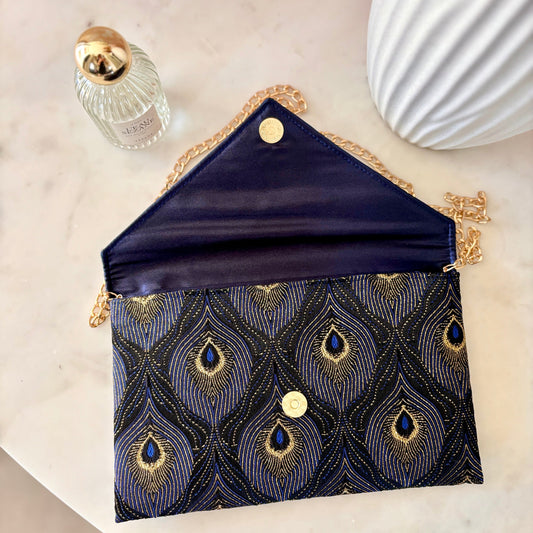 Pochette de soirée bleu nuit en jacquard motif queue de paon