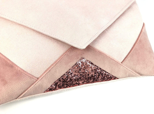Sac pochette mariage écru, rose blush et paillettes dorées