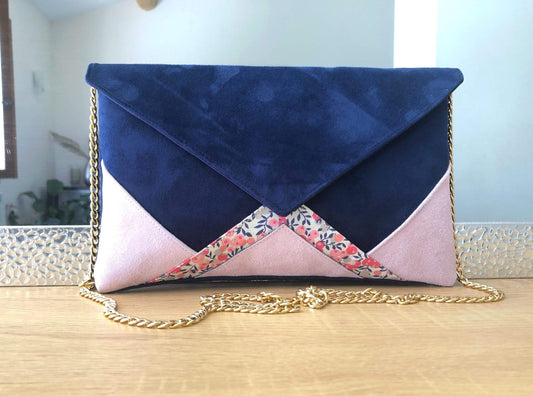 Sac pochette mariage bleu marine, rose poudré et Liberty wiltshire pois de senteur