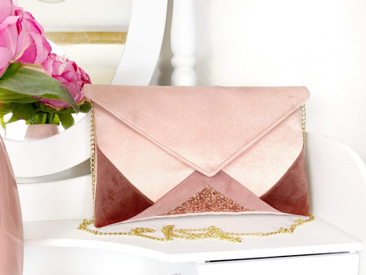 Sac pochette mariage rose pâle, vieux rose et paillettes rose gold