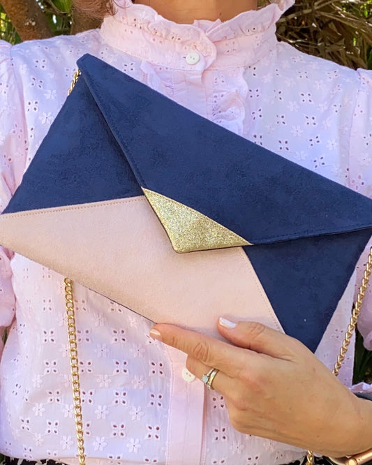 Pochette mariage bleu marine, rose poudré et paillettes dorées