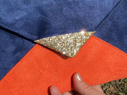 Pochette enveloppe bleu marine et orange, paillettes dorées