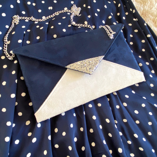 Pochette mariage bleu marine, blanche et paillettes argentées