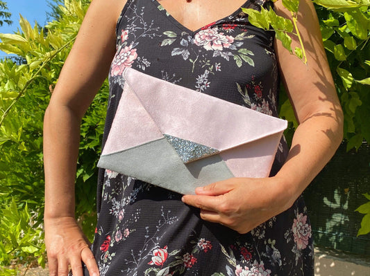 Pochette mariage rose poudré et gris clair, paillettes argentées