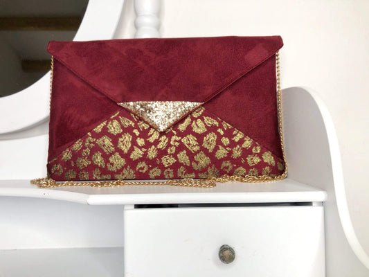Pochette mariage bordeaux et doré avec tissu jacquard motif léopard