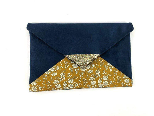 Pochette mariage bleu marine Liberty of London Capel moutarde et paillettes dorées