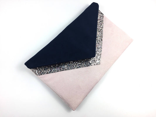 Sac pochette mariage rose poudré bleu marine paillettes rose argentées