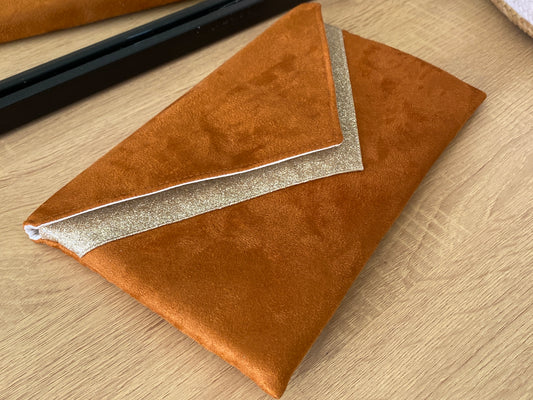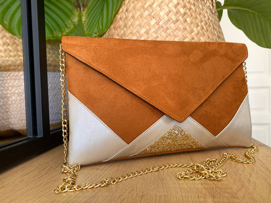 Sac pochette de soirée marron fauve en velours et paillettes dorées