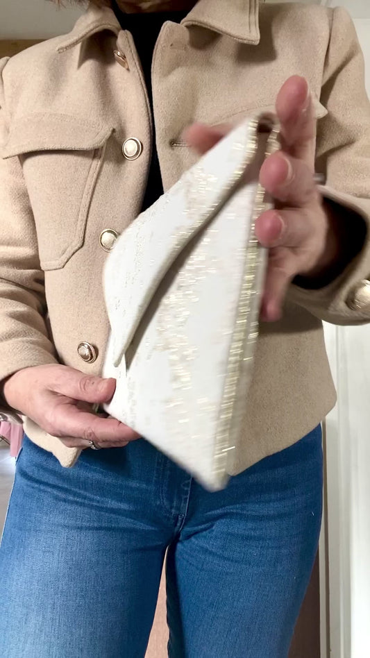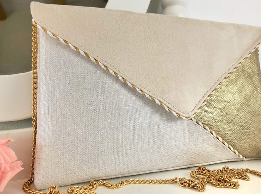 Pochette mariage écru, en lin blanc irisé et lin doré irisé