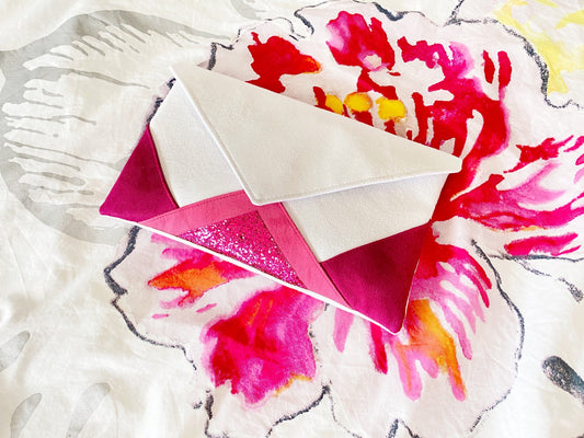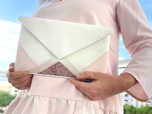 Pochette mariage blanc cassé, nude, rose pâle et rose gold