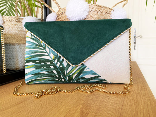 Sac pochette mariage blanche et verte motif tropical idéale pour mariage tropical chic
