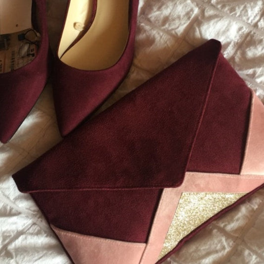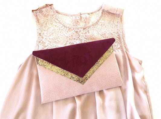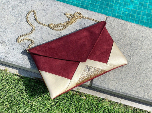 Sac pochette mariage bordeaux et paillettes dorées en suédine