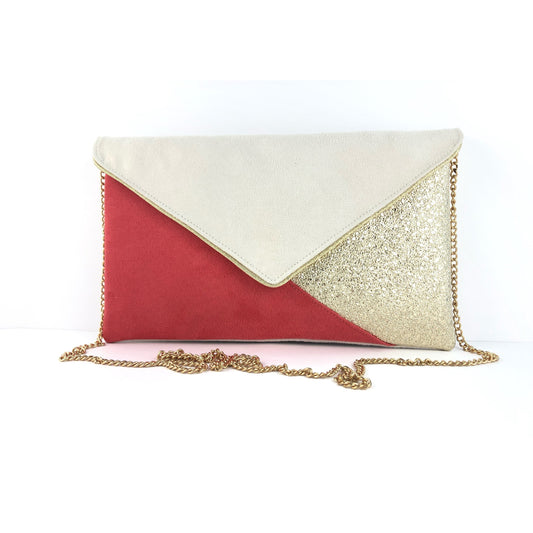 Sac pochette écru et corail en Suédine et similicuir doré effet pailleté