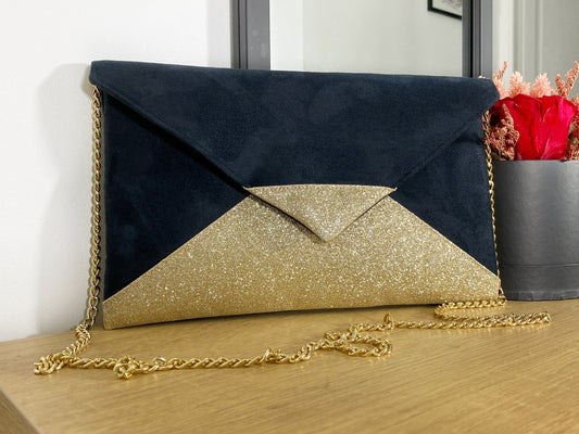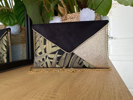 Pochette noire et dorée avec chaîne, idéale pour un mariage ou une soirée