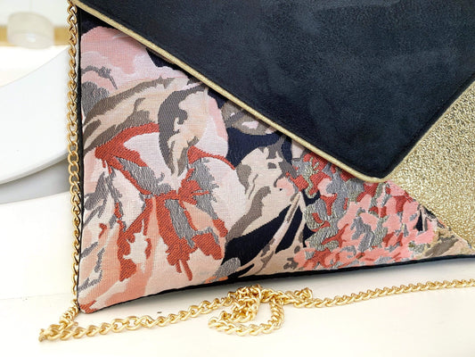 Pochette enveloppe femme noire, tissu jacquard fleurs et simili cuir doré