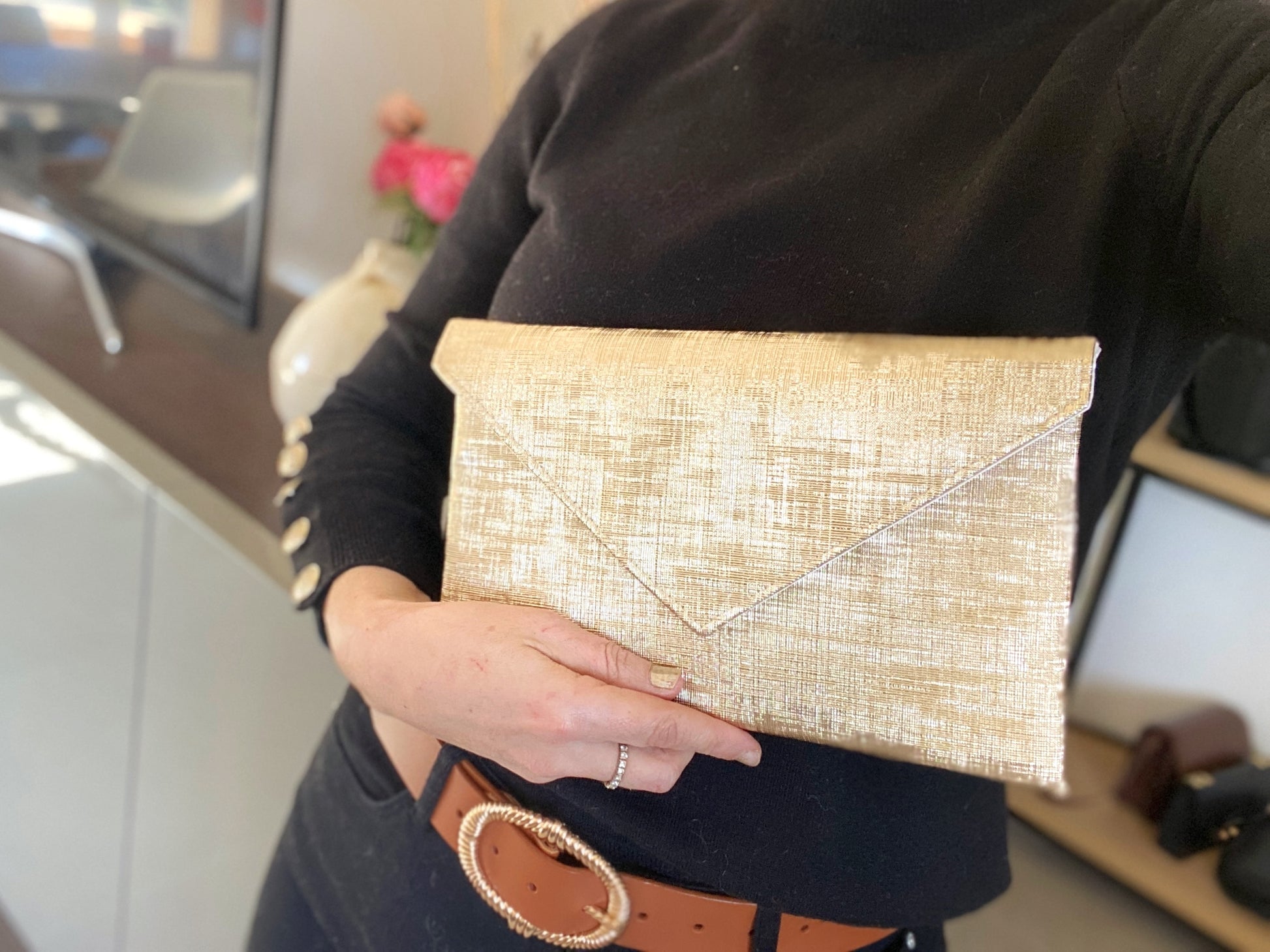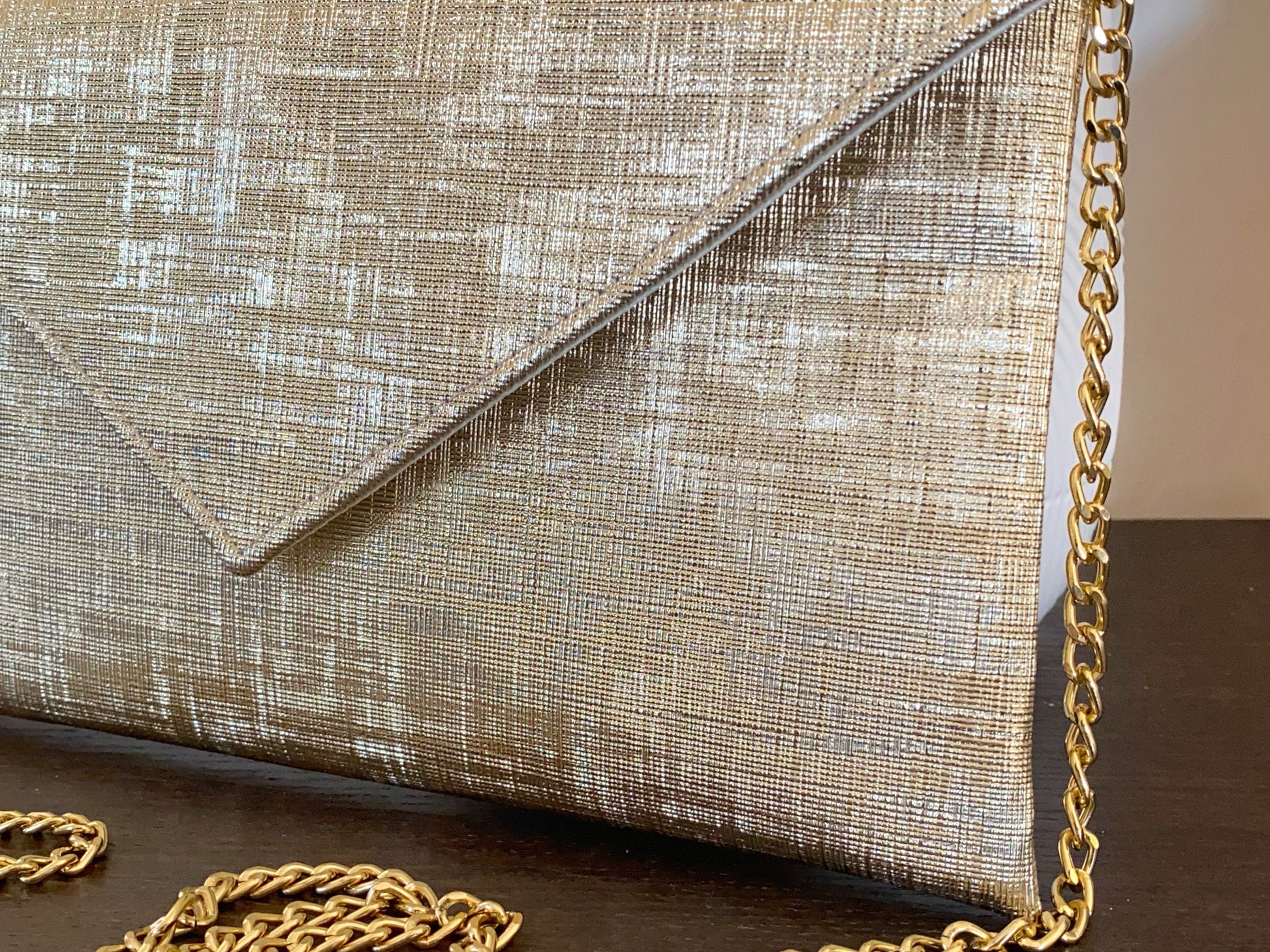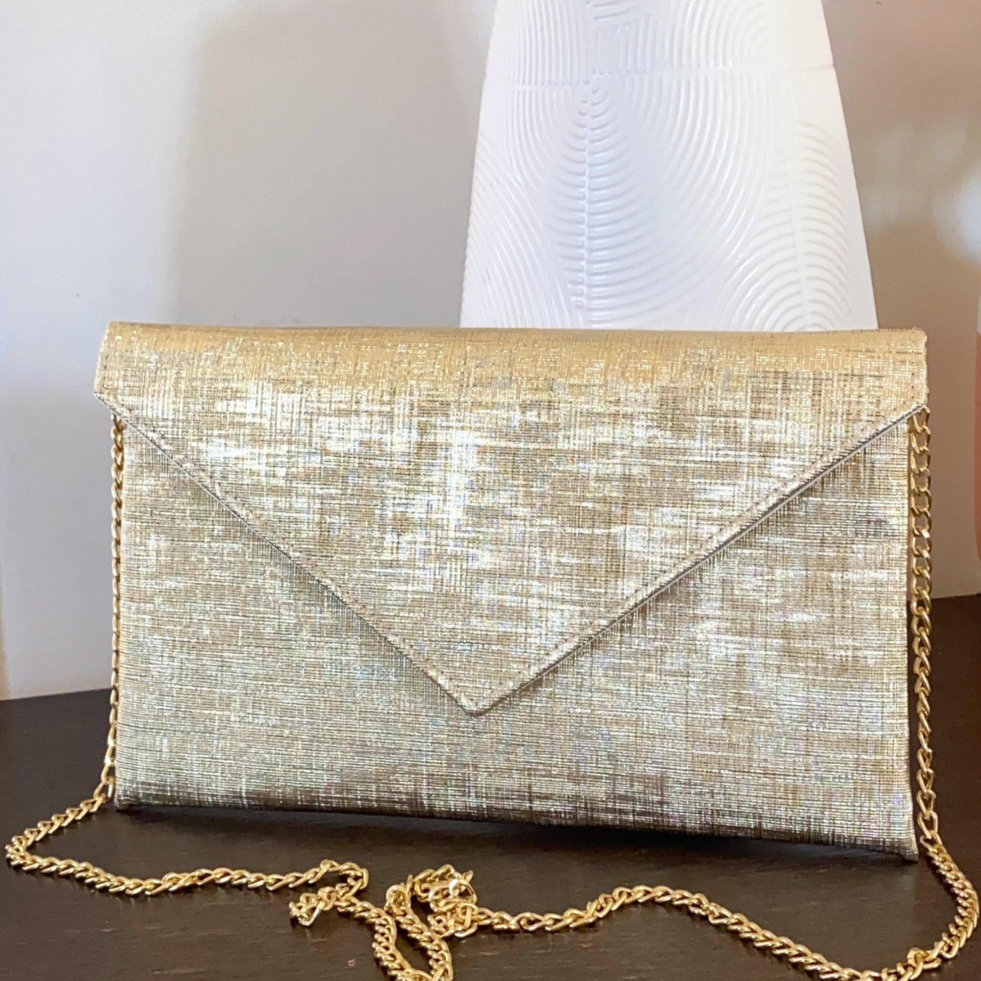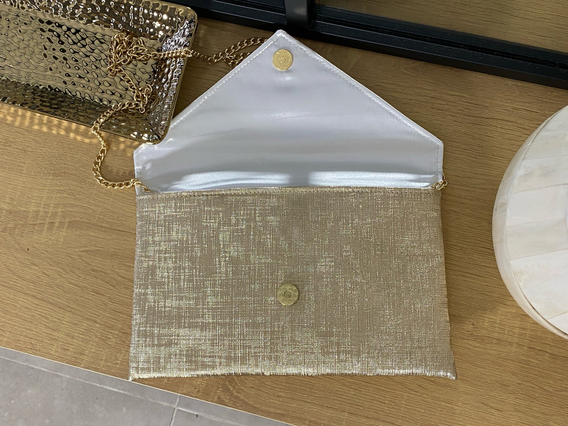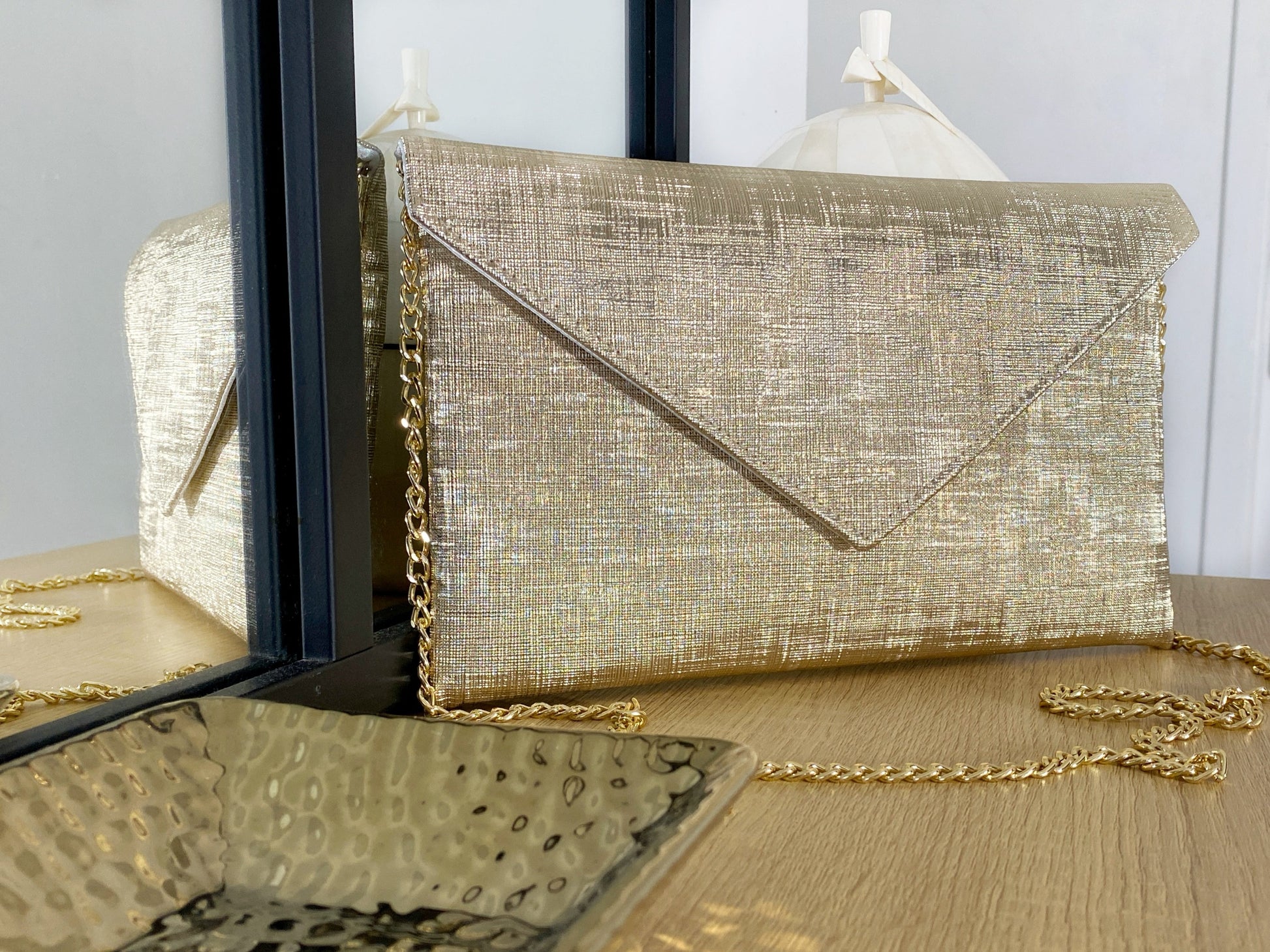 Pochette dorée avec chaîne, idéale pour un mariage ou une soirée