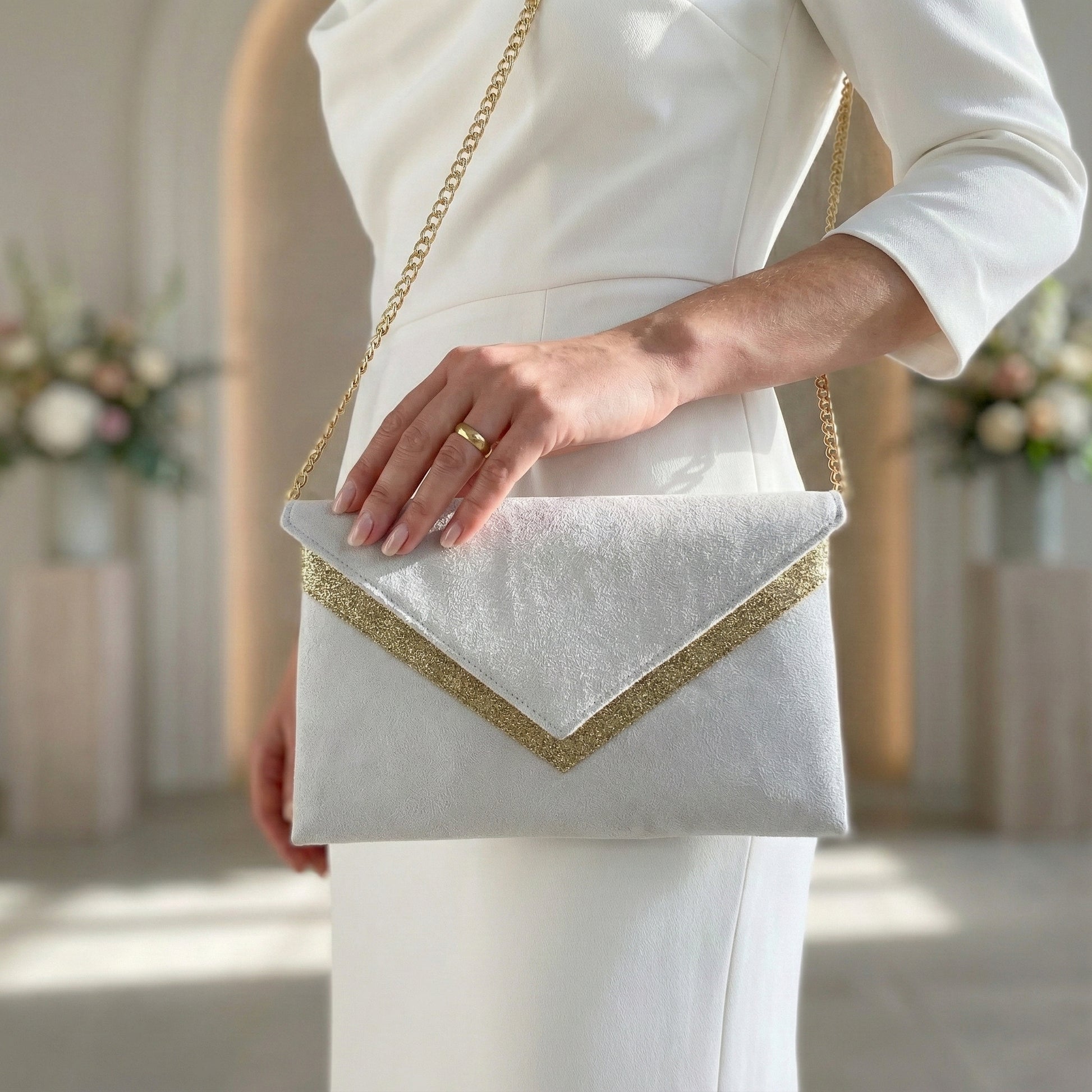 Offrant une touche finale à votre tenue de mariée, cette pochette blanche et dorée se présente avec une chaîne amovible pour que vous puissiez l'utiliser à la main ou à l'épaule et ainsi avoir tout ce dont vous avez besoin.
