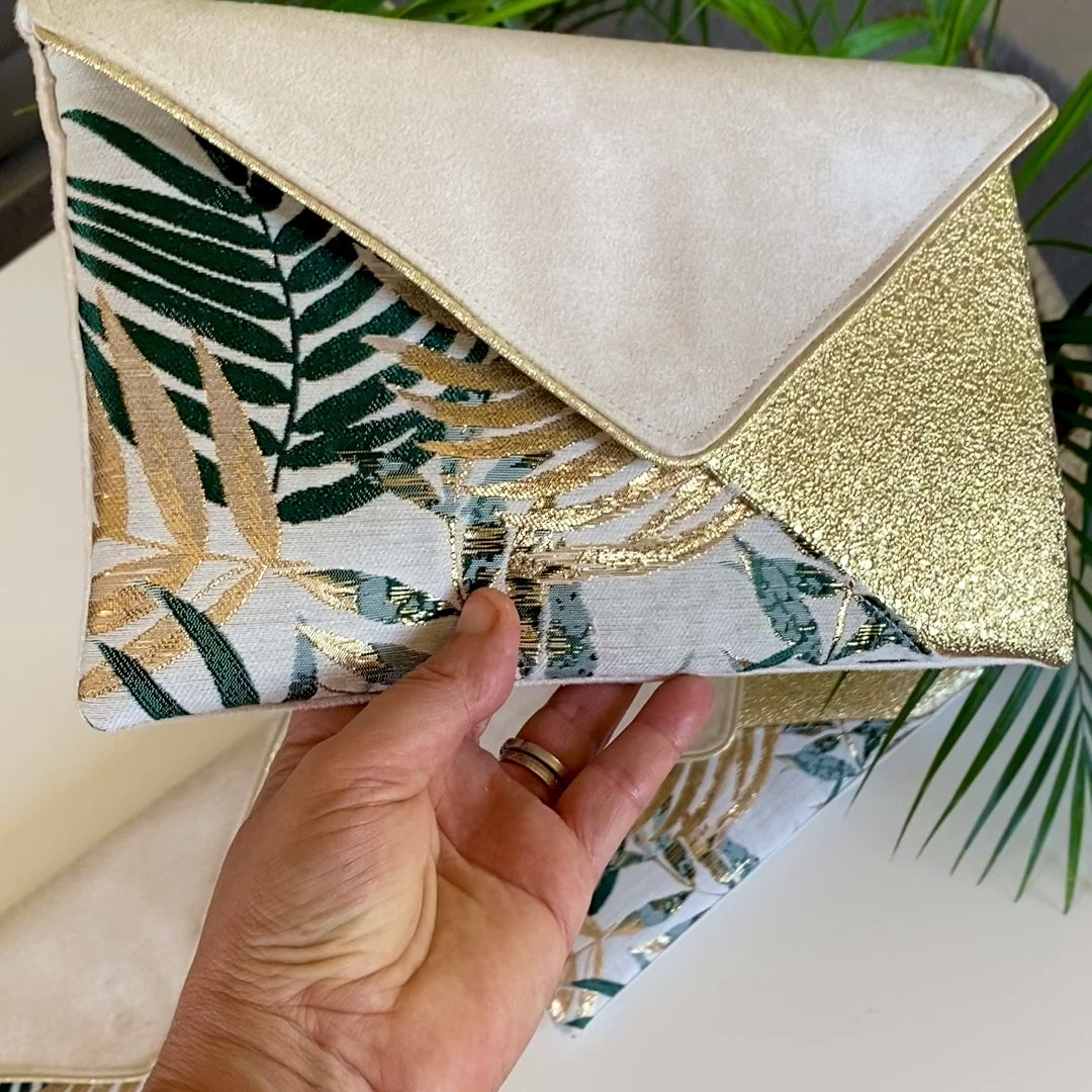 Sac pochette mariage écru, verte idéale pour mariage thème tropical chic